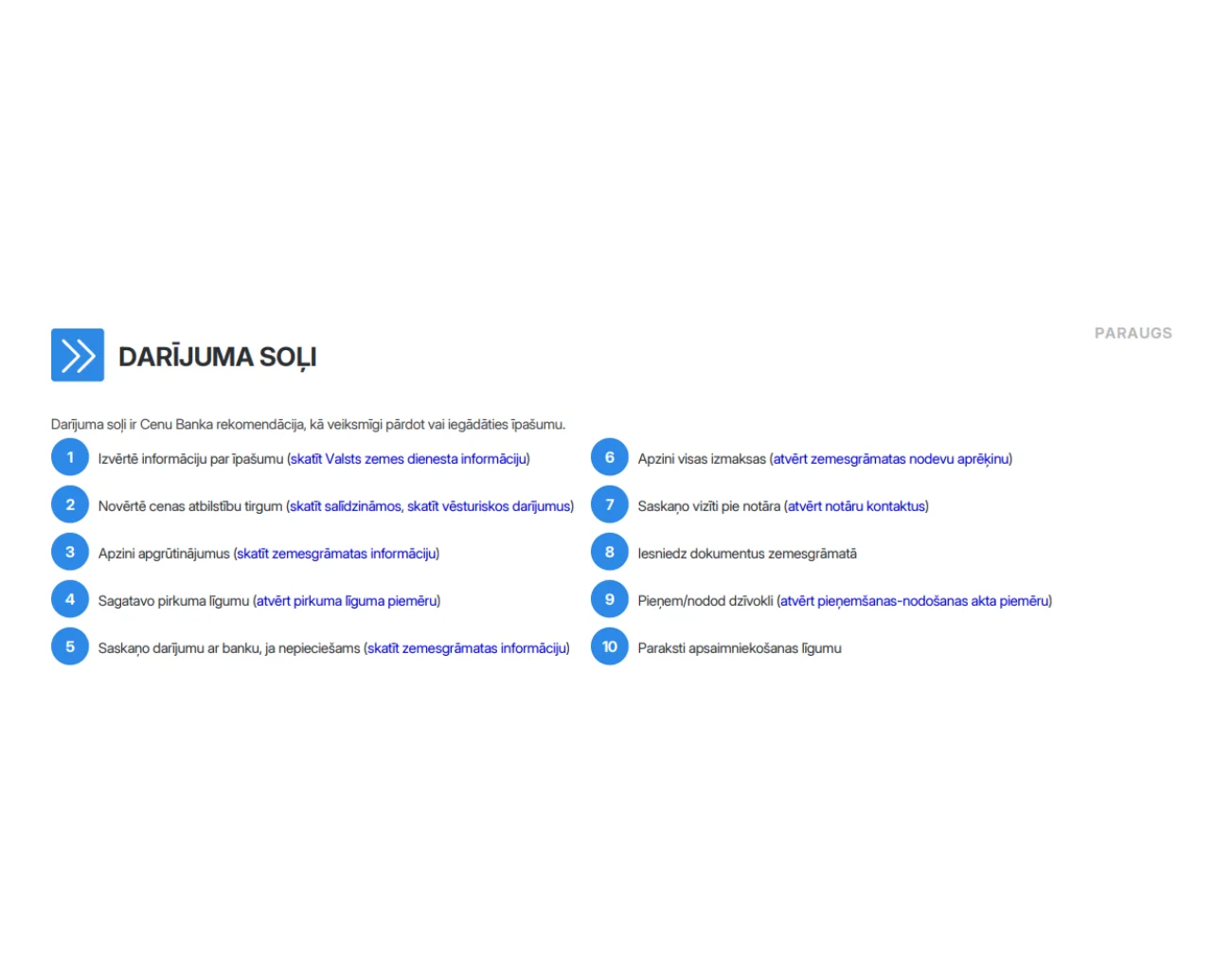 Ieteiktie soļi, ko veikt, kad iegādājies vai pārdod īpašumu. Tajā skaitā, lejuplādējams pirkuma līguma un pieņemšanas - nodošanas akta paraugs, saite uz zemesgrāmatas nodevas aprēķinu un notāru kontaktiem.