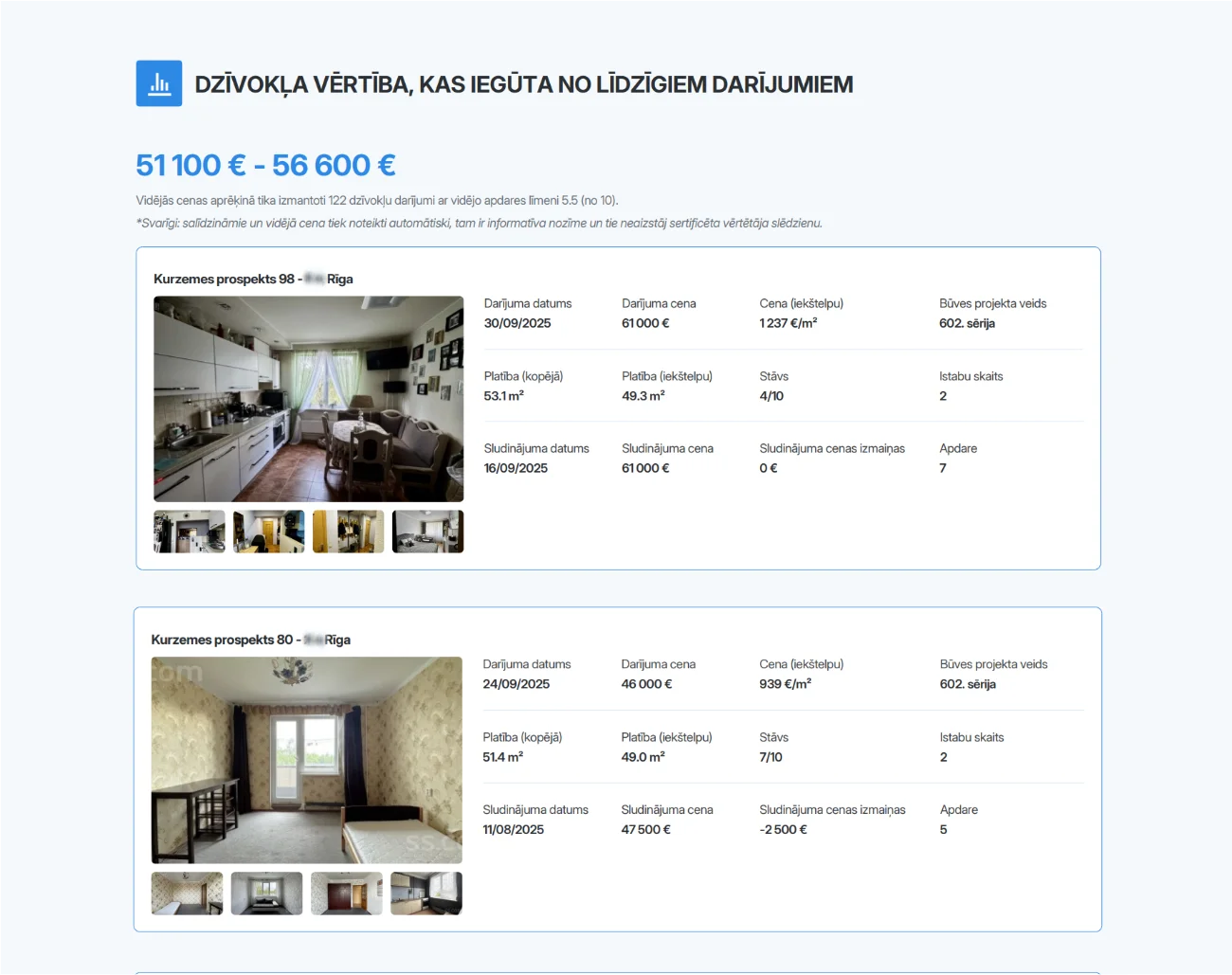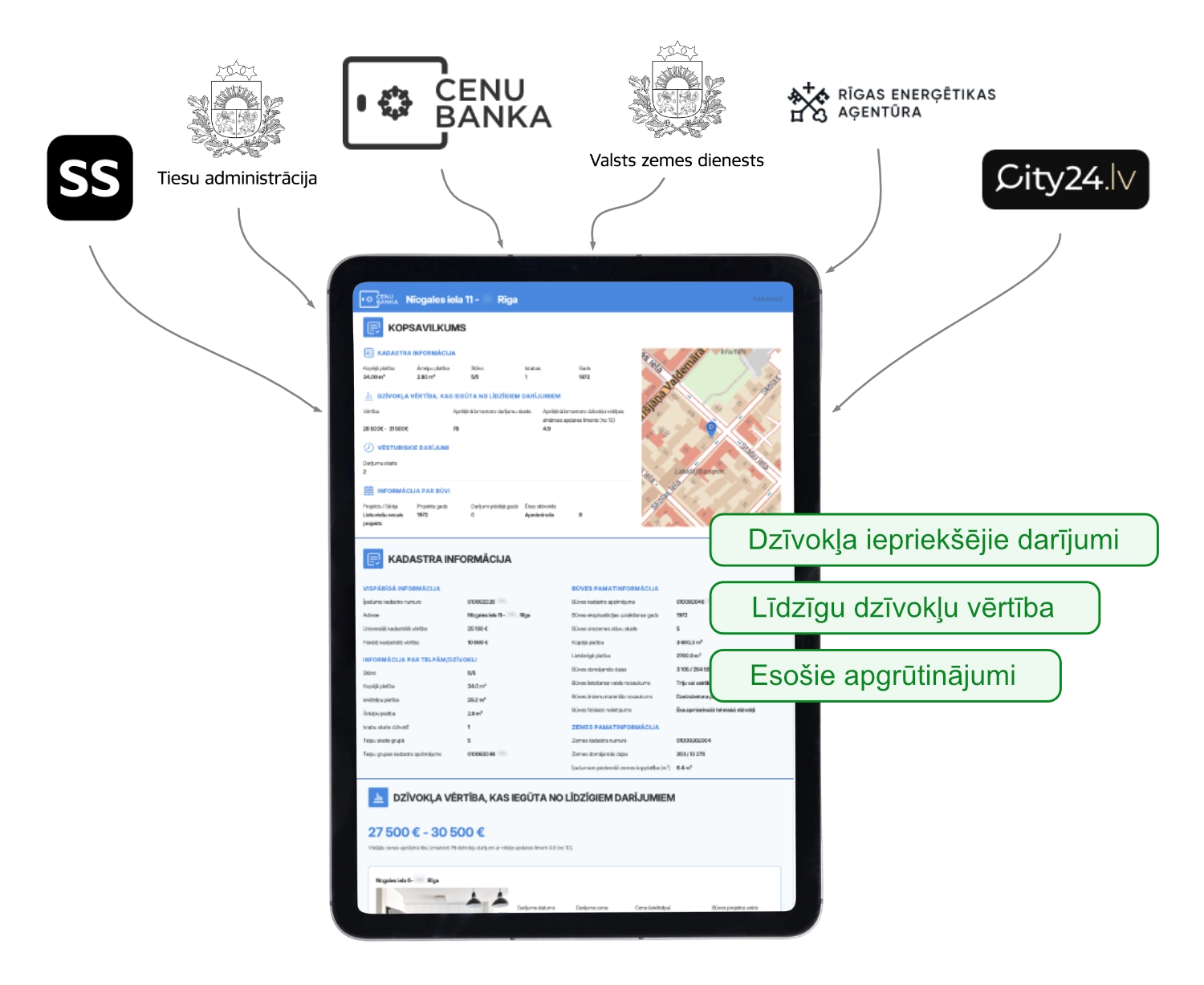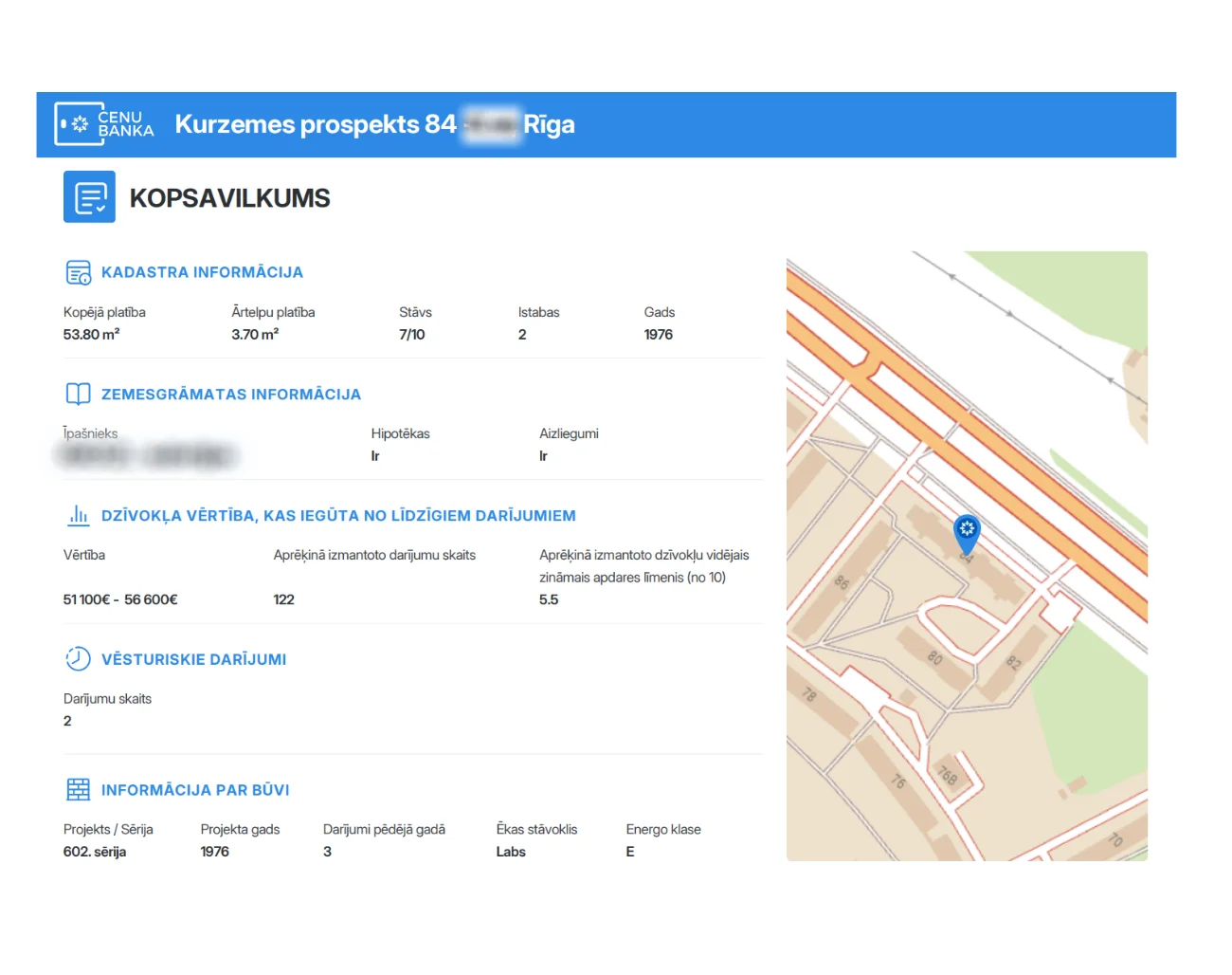 Uzzini aptuveno dzīvokļa vērtību, esošos apgrūtinājumus, līdzīgu dzīvokļu cenas, kadastra un zemesgrāmatas oficiālos datus, iepriekšējos dzīvokļa un citus ēkas darījumus.