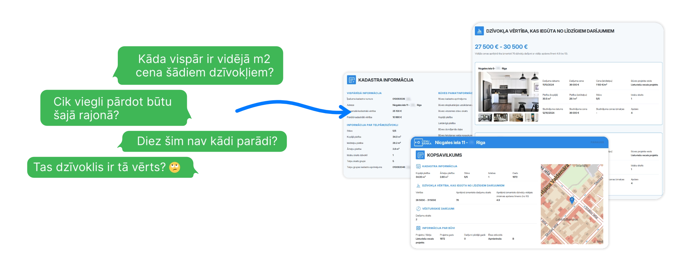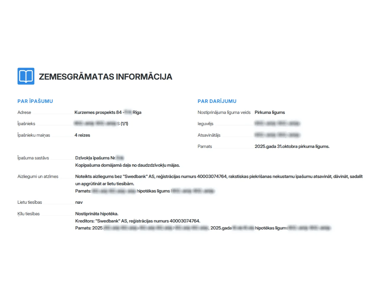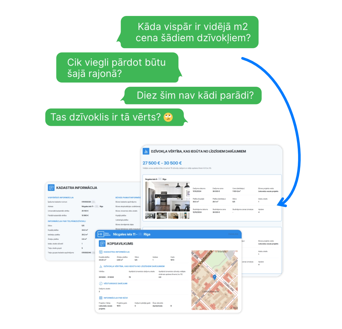 Uzzini aptuveno dzīvokļa vērtību, esošos apgrūtinājumus, līdzīgu dzīvokļu cenas, kadastra un zemesgrāmatas oficiālos datus, iepriekšējos dzīvokļa un citus ēkas darījumus.
