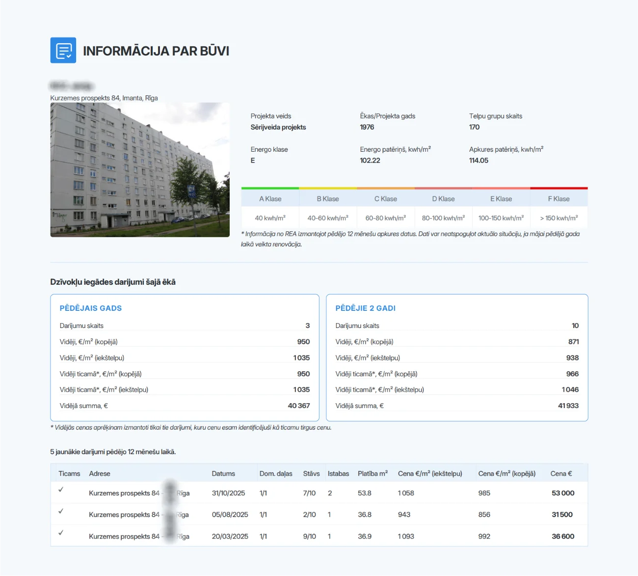 Informācija par ēkas projekta veidu, celšanas gadu, dzīvokļu skaitu ēkā, kā arī ēkas energoefektivitātes rādītājiem. 5 jaunākie darījumi ēkā, gada un divu gadu darījumu kopsavilkums.