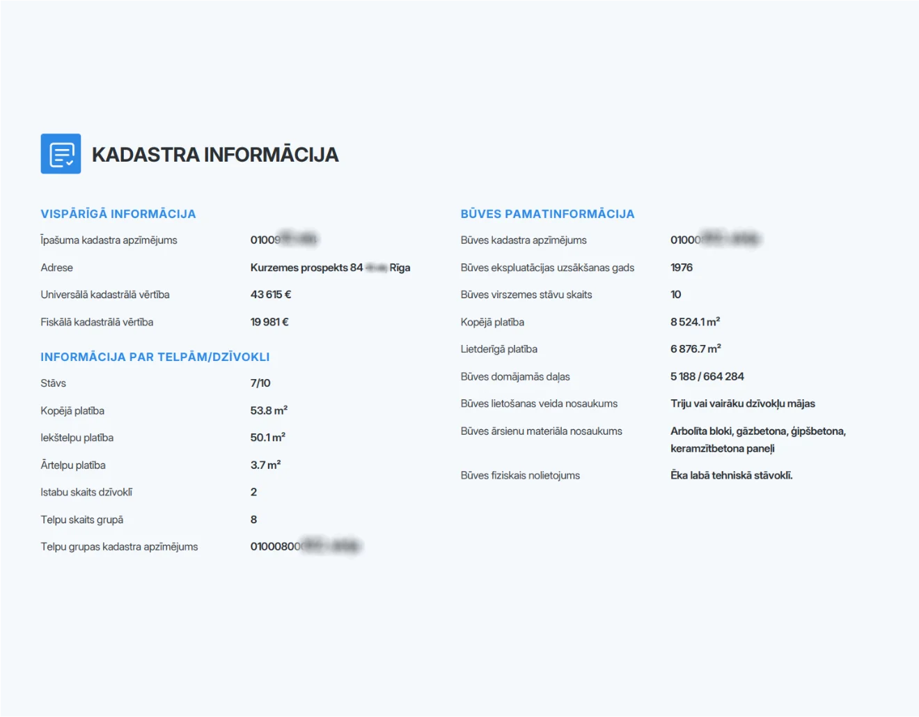 Oficiāla kadastra informācija. Īpašuma platību, stāvu, istabu skaitu, būves gadu, u.c. Pārliecinies vai dzīvokļa sludinājumā minētais atbilst tam, kas ir reģistrēts kadastrā.