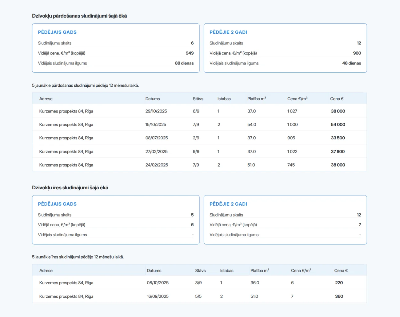 Iegūsti informāciju par 5 jaunākajiem pārdošanas un īres sludinājumiem ēkā. Kā arī kopsavilkumu par pēdējā gada un pēdējo divu gadu laikā publicētajiem sludinājumiem: sludinājumu skaits, vidējā kvadrātmetra cena un vidējais sludinājumu ilgums.