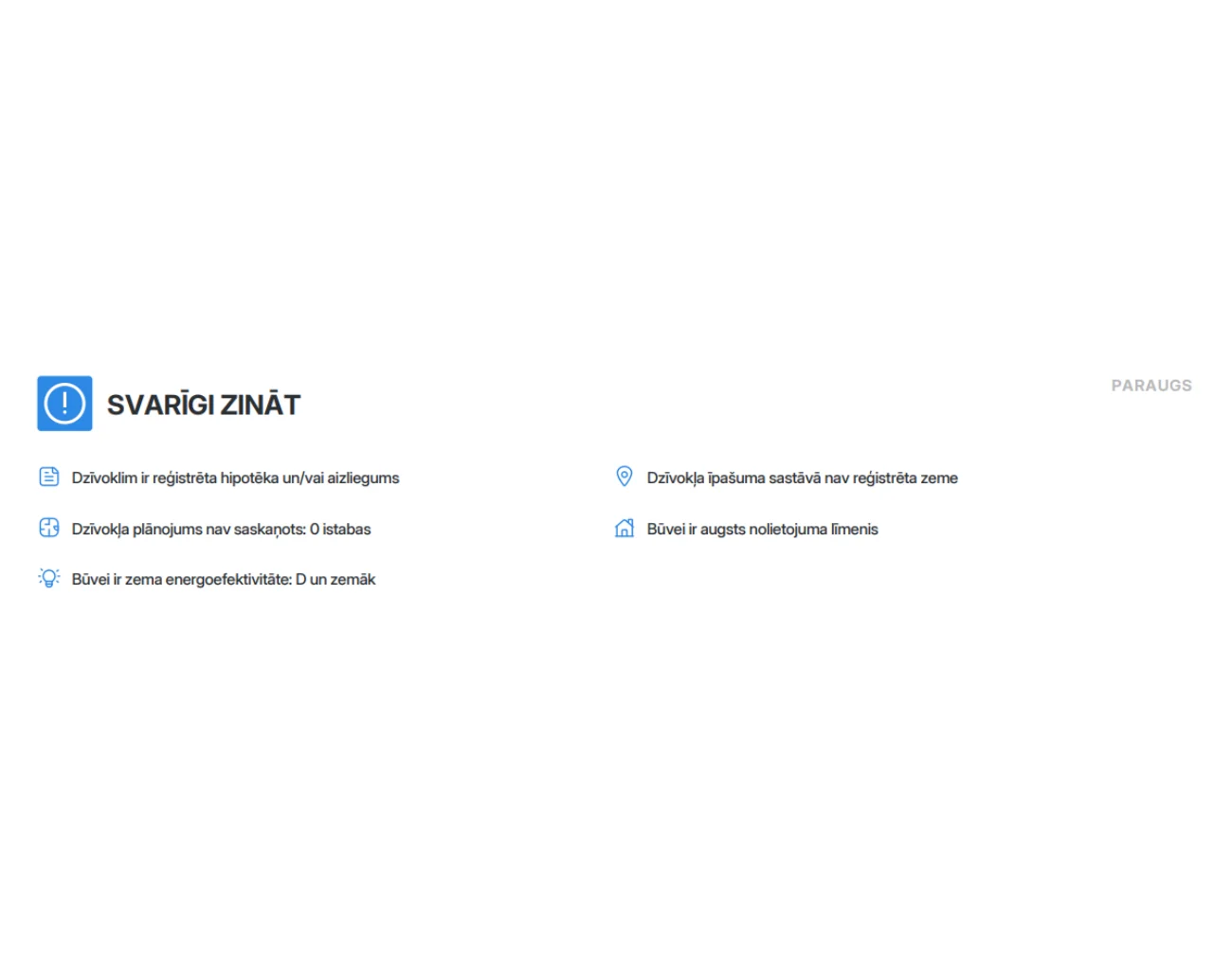 Īpašuma riski un būtiskie brīdinājumi. Apkopota informācija par hipotēkām un aizliegumiem, zemes neesamību īpašuma sastāvā, augstu ēkas nolietojumu un zemu energoefektivitātes klasi.