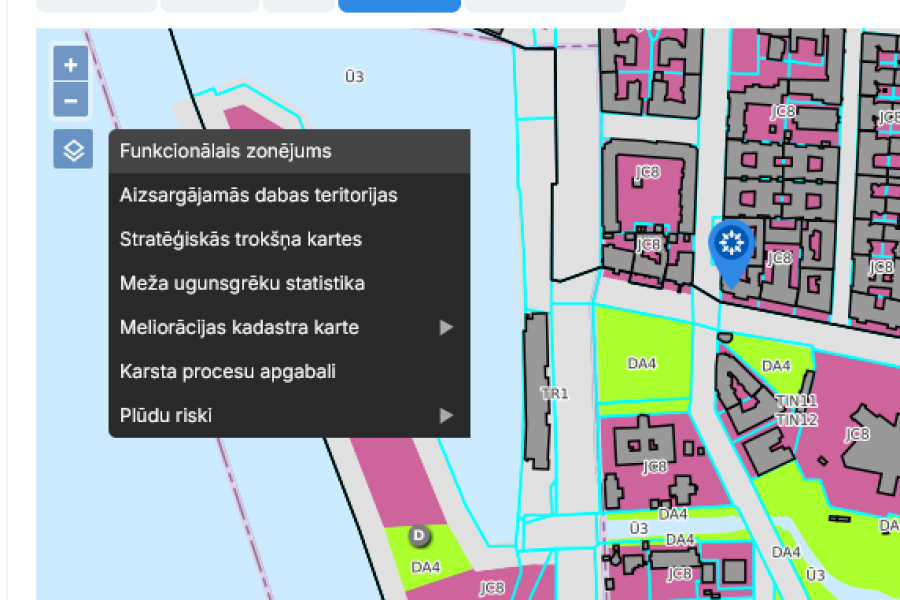 Lapā "Cenas" ir pieejams funkcionālais zonējums ar zemju un būvju kadastra robežām.